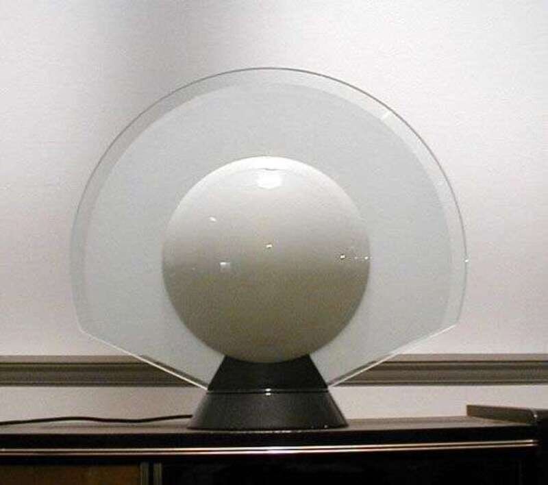 With fan-shaped frosted glass panel enclosed by a grey globe (night) on one side and a white globe (day) on the other, on a rotating circular base, FLOS sticker, h: 18 in.