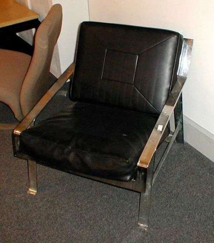 The seat frame and legs composed of flat steel slats, vinyl upholstered cushions, h: 28.5, w: 28, d: 31 in.