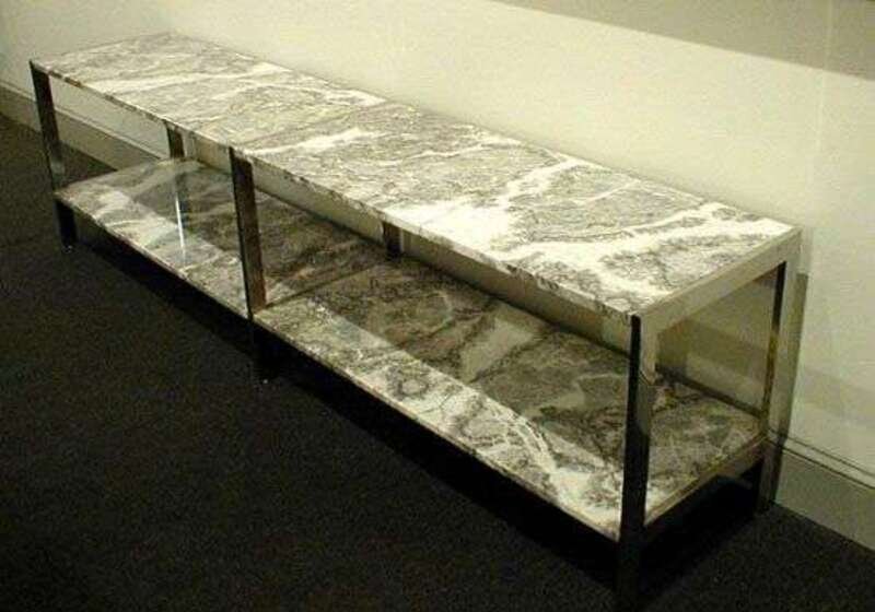 With bracketed chrome base and four inset white Italian marble slabs, h: 27, l: 99 in.