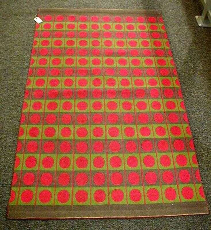 With repeating pattern of ovals within lines in red, gray and green, labeled, 35 x 59 in.