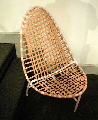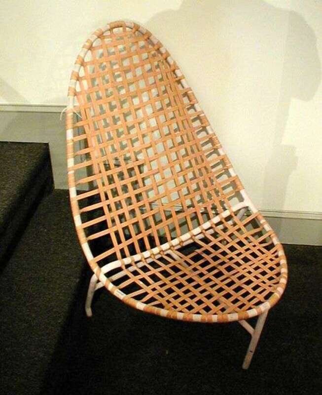 With pink metal tubular frame and plastic woven seat, h: 41 in.