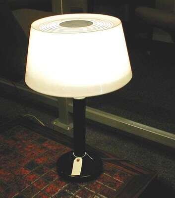 With a flaring circular white plastic shade on a simple black metal base, h: 22 in.