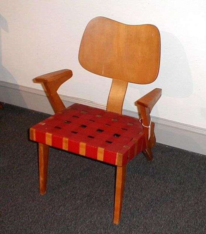 With organically shaped molded plywood back on a rectangular seat with nylon webbing, rectilinear arms and legs, h: 31 in.