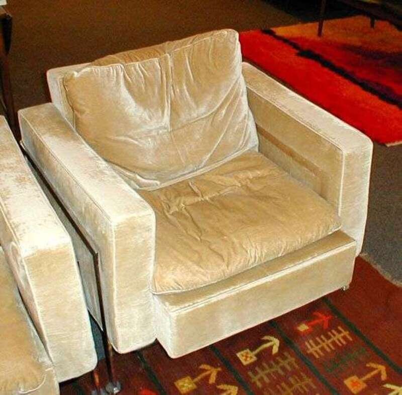 Each with simple chromed steel rectilinear frame and tan upholstered cushions, labeled, worn upholstery, h: 29, w: 35.5, d: 34 in.
