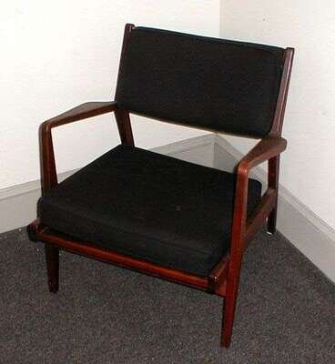 Teakwood with black upholstered seat and back, labeled, h: 29, w: 27 in.
