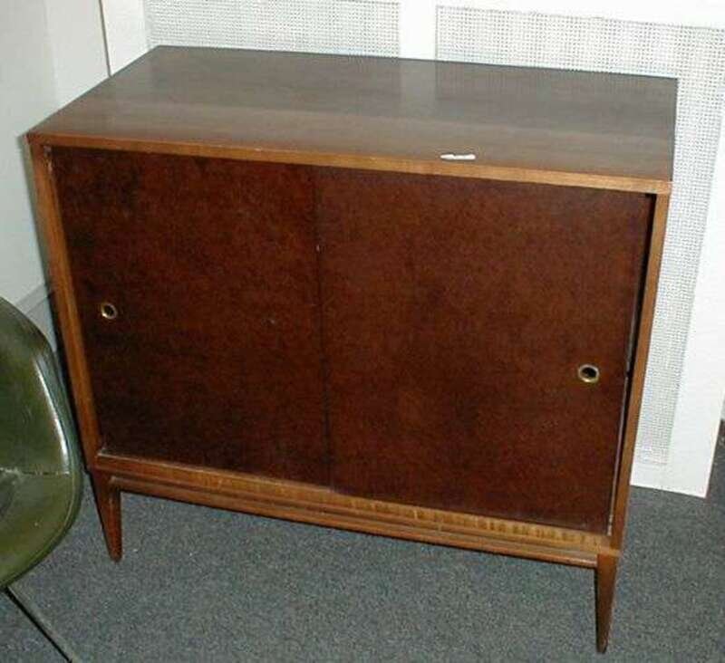 With two sliding doors enclosing a compartment with single adjustable shelf, on four tapered legs, foil label, h: 33, w: 36, d: 18 in.