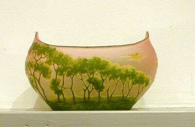 Of elongated bulging form with green trees and landscape scene overlaid on a pink ground, engraved "deVez," l: 7, h: 4.5 in.