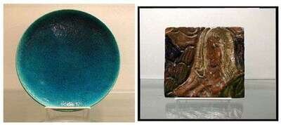Circular, covered in a crackled Egyptian blue glaze, signed "LACHENAL" in ink, dia: 8.7 in.; together with a studio pottery tile with a head of a woman, signed Z.H to reverse with artist's cipher, 5.3 in. square.