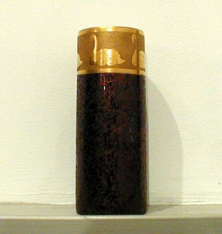 Of cylindrical form with band of "engraved" gold swans above a metallic-etched lustre glaze, etched "J. May," h: 7.75 in.
