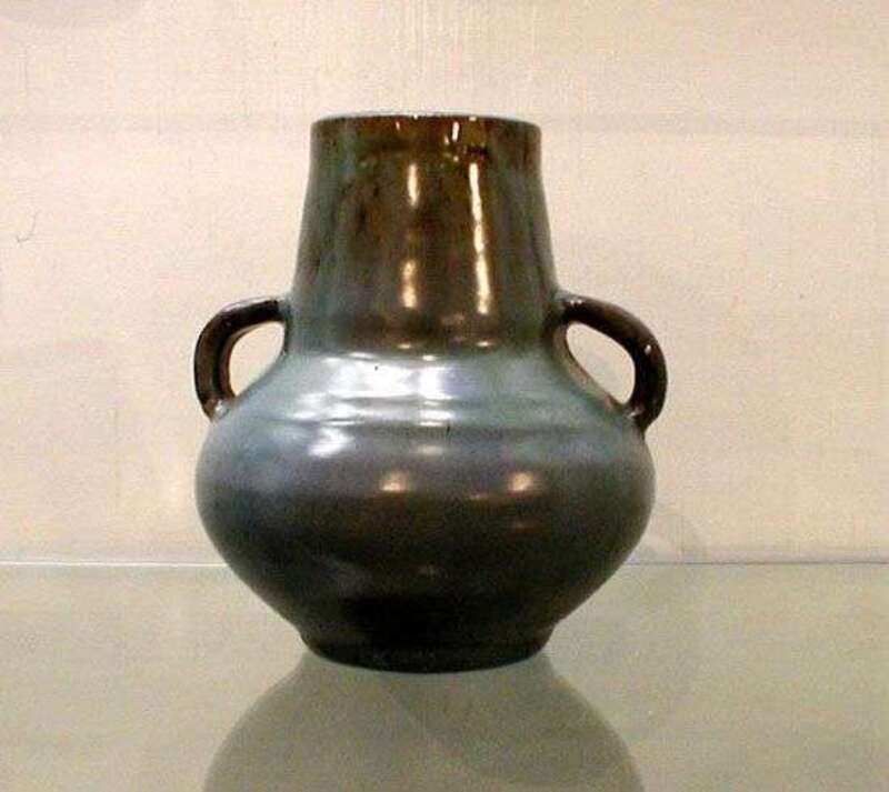 Of bulbous form with twin handles, covered in a blue semi-matte glaze, incised "Upchurch," h: 5.25 in.