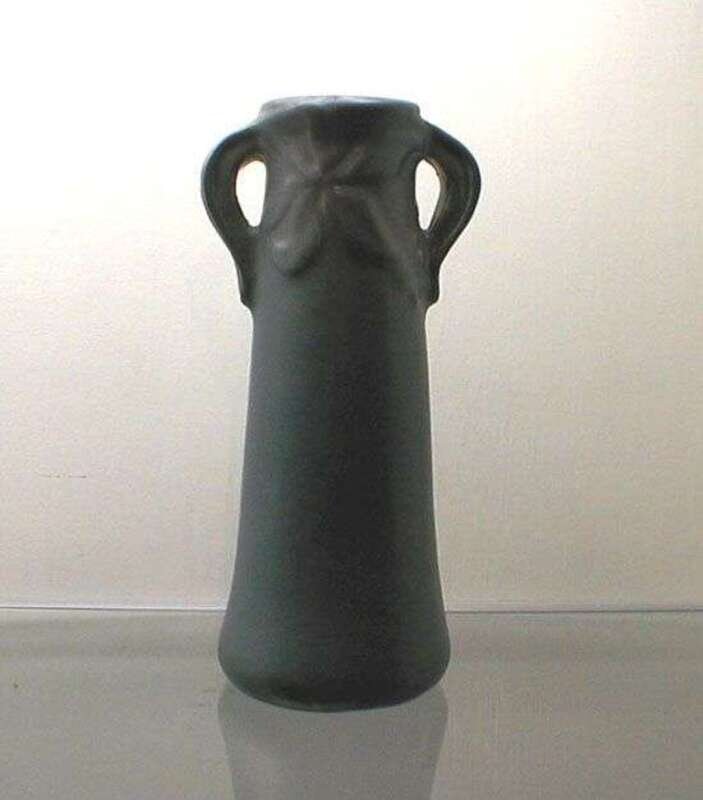Of tall, tapering form with strap handles and applied leaf and berry design under a matte blue glaze, incised mark and date 1915, cracks, h: 10.5 in.