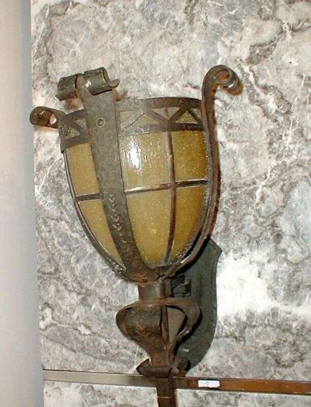 With vaseline glass open basket light caged in scrolled wrought iron on a twisted shaft, hammered mounting escutcheons, electrified, h: 56 in.