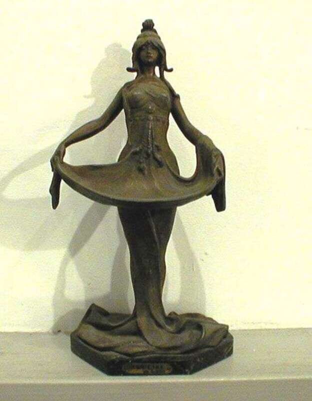Being a white metal figure of a girl with outstretched arms and drapery (possibly a calling card tray), on a red marble base, the metal cast "L.Alliot," the base with escutcheon reading "NUBIENNE par L. Alliot," h: 10.75 in.