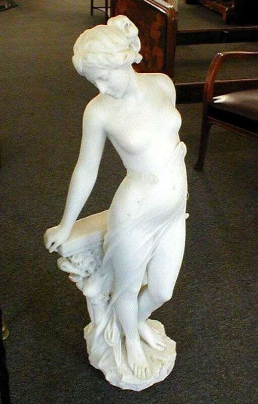 Of carved alabaster, a nude woman leans on a balustrade, a breasted dragon beneath, carved signature to reverse, h: 47 in.
