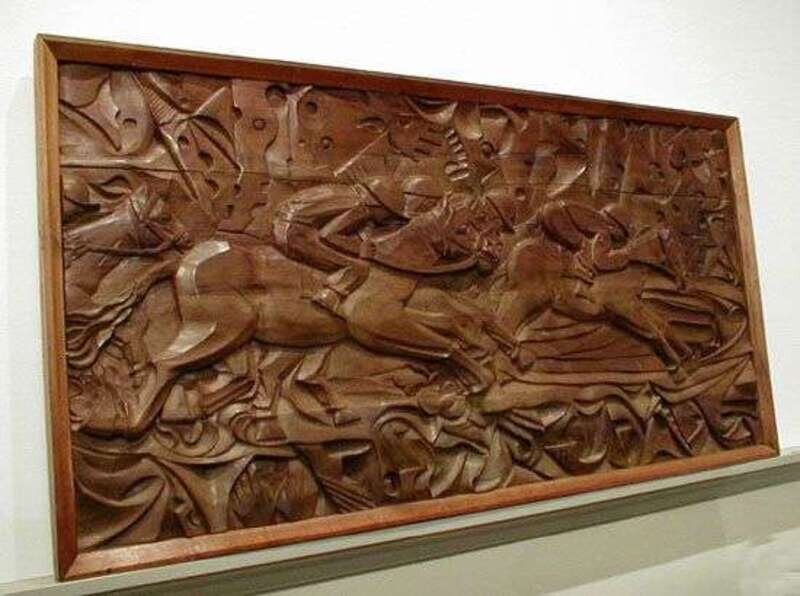 A carved hardwood panel in the cubist style with jockeys racing horses, signed lower right, cracked, framed, sight: 38 x 78 in.