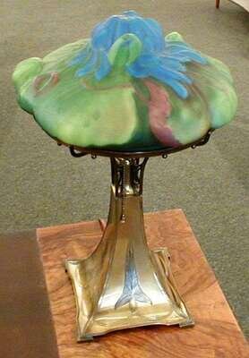 The shade with blue and pink flowers against green leaves, on an engraved metal Art Nouveau base, traces of signature to shade, base marked "PAIRPOINT MF'G CO.," P in diamond trademark and number 3052, total height: 20 in.