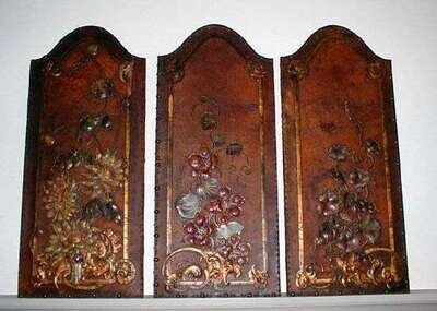 THREE ART NOUVEAU PYROGRAPHIC LEATHER PANELS