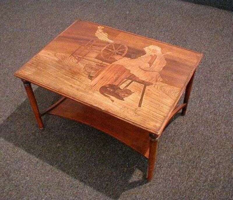 Of rectangular form with marquetry scene of an old woman at the knitting wheel, her cat sits nearby, inlaid signature with Cross of Lorraine, turned legs and shelf stretcher beneath, h: 16.75, top: 20.3 x 28.3 in.