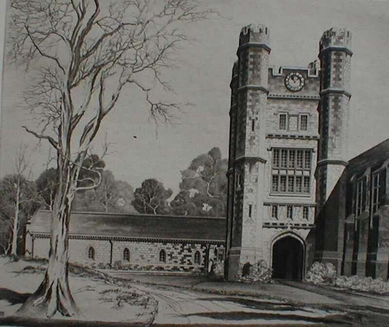 Etching. Arms, John Taylor. "Dillon Gymnasium" [Princeton]. 1947. 7 7/8 x 9 1/4 inches (200 x 235 mm), full margins. Signed & dated in pencil by Arms, lower margin. Clean.