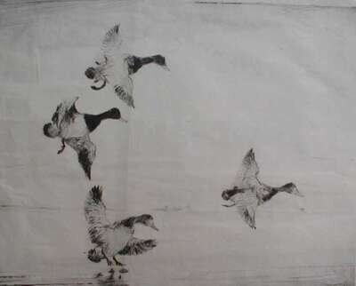 Drypoint. Benson, Frank W. "In Dropping Flight." 1926. 10 3/4 x 13 3/4 inches (275 x 349 mm), margins. Signed in pencil by Benson, lower margin. Light glue stains to verso, minor creasing.