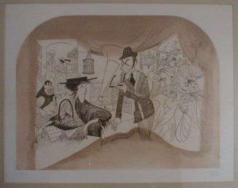 Etching with Wash Border. Hirschfeld, Al. My Fair Lady. Ca. 1960. 114/150. 11 3/4 x 15 3/4 inches (298 x 400 mm), margins. Signed & numbered in pencil by Hirschfeld, lower margin. Generally clean. Framed.