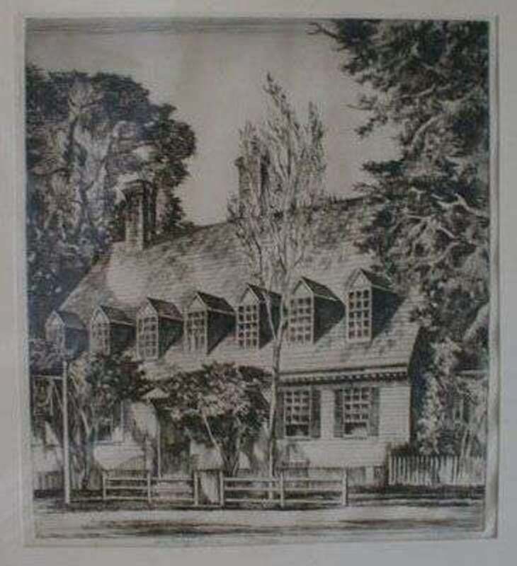 Etching. Horter, Earl. "Old Raleigh Tavern." Ca. 1925. 1/8. 10 1/4 x 9 inches (260 x 229 mm), margins. Signed, titled & numbered in pencil by Horter, lower margin. Framed.