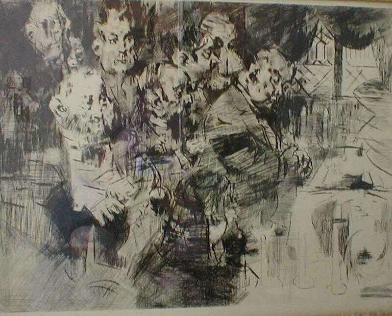 Drypoint & Engraving. Levine, Jack. "Gangster's Funeral." 1965. 102/120. 19 1/8 x 25 3/16 inches (490 x 645 mm), margins. Signed & numbered in pencil by Levine, lower margin.