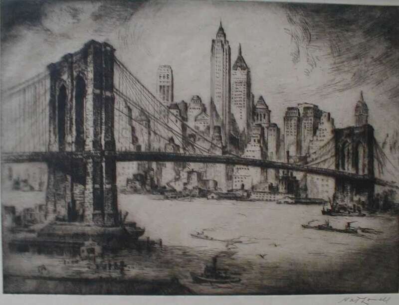 Etchings. Lowell, Nat. [New York Scenes]: "Tip of Manhattan." 9 1/4 x 11 15/16 inches (235 x 303 mm), full margins. * Lower Manhattan. 10 1/8 x 12 1/2 inches (257 x 318 mm), full margins. * Brooklyn Bridge. 9 15/16 x 12 13/16 inches (252 x 325 mm), full margins. * Central Park East. 11 7/8 x 8 3/8 inches (301 x 212 mm), full margins. All ca. 1940-1950. All Associated American Artists, edition sizes ca. 250. Each signed in pencil by Lowell, lower right. All clean.