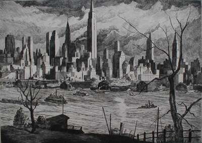 Etching. McNaulty, William C. "New York from Stevens Institute." 1935. Edition size 100. 10 33/4 x 15 1/8 inches (273 x 384 mm), wide (full?) margins. Signed, titled & dated in pencil by McNaulty, lower margin. Good, rich impression.