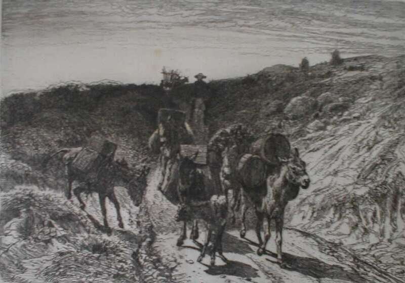 Etching. Moran, Peter. "A Burro Train, New Mexico." Ca. 1880. 6 7/8 x 9 3/4 inches (175 x 247 mm), margins. Minor wear & light dust soiling.
