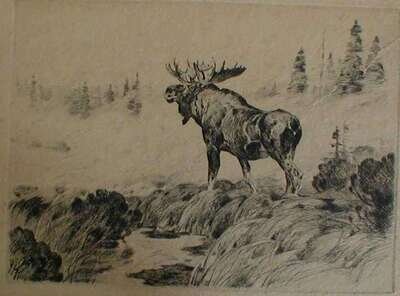 Etching. Rungius, Carl C. Bull Moose. Ca. 1890. 6 1/4 x 8 1/2 inches (158 x 215 mm), margins. Signed in pencil by Rungius. Glued down on board, margins frayed, some spotting.