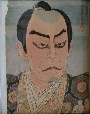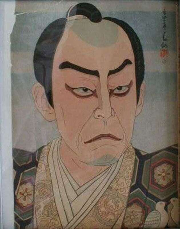 Color Woodblock Print. Shunsen, Natori (Japanese, 1886-1960). Kabuki actor. Approx. 13 1/2 x 9 7/8 inches (343 x 250 mm). Publisher's seal, artist's signature in block. Vivid impression on brittle paper, upper left corner chipped away, a few separations with no further loss of paper.