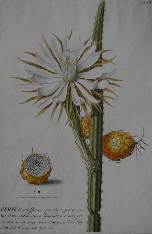 Hand-Colored Engravings. Ehret, Georg Dionysius. "Cereus" [Cactus in flower -2 views]. [Plates 14 & 32 from C.J. Trew's Plantae Selectate, Nuremberg, 1750-1792.] 16 3/4 x 11 1/4 inches (425 x 285 mm). * 16 3/4 x 11 inches (425 x 280 mm). Capitals of titles decorated in gold. Clean, well-colored, strong impressions.