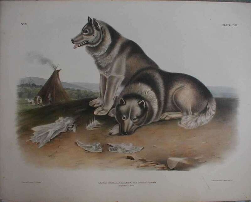 Hand-Colored Lithographs. Audubon, John James: "Esquimaux Dog." Philadelphia: Bowen, 1847. Folio sheet, laid down on bd.; some chipping to edges but generally clean & intact. * "White Weasel." Philadelphia: Bowen, 1845. Folio sheet, laid down on bd.; some chipping & browning. Both framed. [The Viviparous Quadrupeds of North America, plates 113 & 54.]