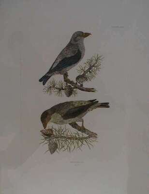 Hand-Colored Engravings. Selby, Prideaux John: "Parrot Grossbill,..." * "Cross Bills." Ca. 1840. 15 3/4 x 11 inches (400 x 280 mm), full margins. Clean.