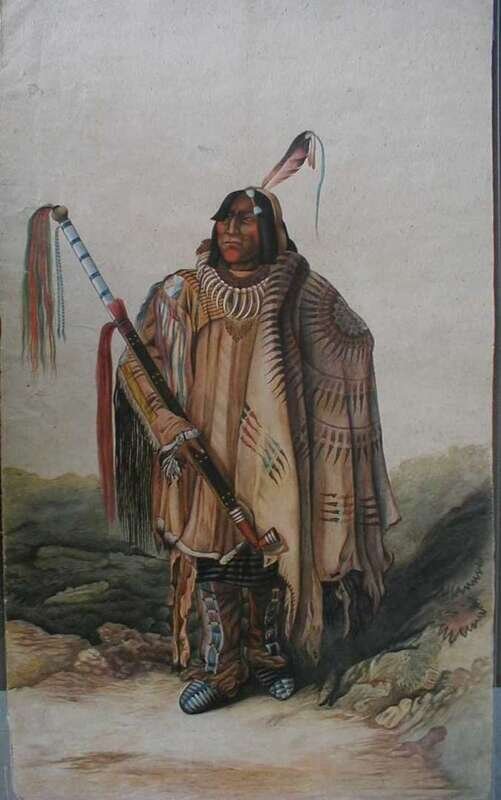 Earth Pigment & Vegetable Dyes. Bodmer, Karl, after. Mandan Chief. 22 1/2 x 13 1/8 inches (571 x 333 mm). 19th-century hand-made paper, modern, skillful color drawing.