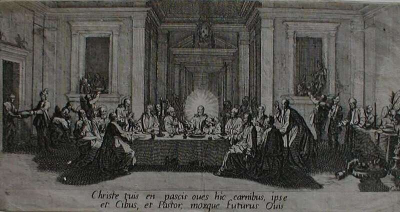Etching. Callot, Jacques. "La Cene" [from La Grande Passion]. 1618. First state. 3 7/8 x 8 7/16 inches (99 x 214 mm). Narrow margins.