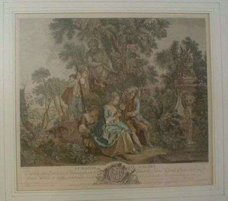 Hand-Colored Engraving. Lebas, Jacques Phillippe after Lancret, Nicolas. "Le Maitre Galant." [Paris], ca. 1750. 15 3/4 x 18 inches (400 x 457 mm). A few creases & expert repairs. Framed.