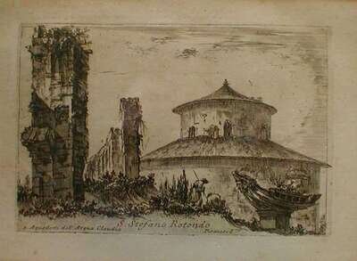 18th-Century Engravings: Piranesi, G.B. "S. Stefano Rotorido." 5 x 7 1/2 inches (127 x 190 mm), margins. Light scattered foxing. Framed. * "Antibes" [France]. [Town, harbor & countryside plan.] 5 x 6 1/2 inches (127 x 165 mm). Framed.