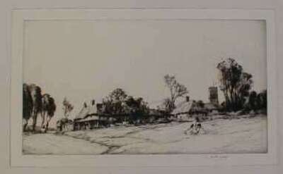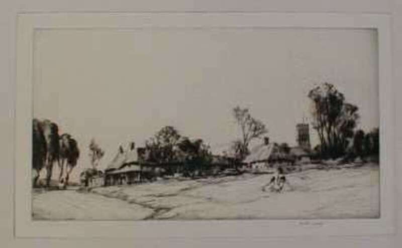 Etchings. British Artists. Country village & town views. Late 19th-century, small folio & 4to: M. Hardie, "A Dorset Village." * G.H. Randall, "An Autumn Twilight," framed. * Frank Short, town view, (English Etchers Part XLIX), framed.