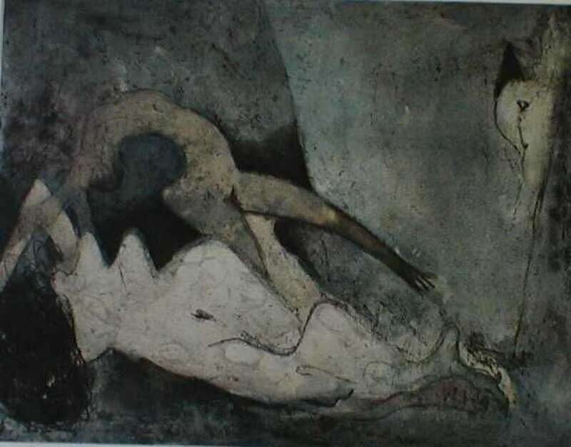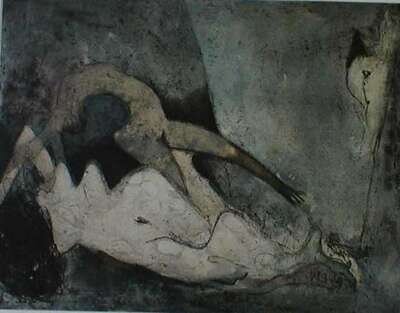 (Modern Art Graphics). Color etching. Tanning, Dorothea. "Leda and the Swan." 1966. 32/60. 12 3/4 x 16 11/16 inches (324 x 424 mm), full margins. Numbered & signed in pencil by Tanning. * Color offset lithographic poster. "Max Ernst, Lithographien Radierungen...[19]71." 25 x 20 inches (635 x 508 mm), including margins. Condition: A. Poster issue of Brusburg 108P.