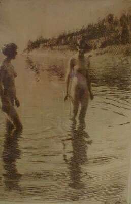Etching. Zorn, Andreas. "Shallow." 1913. 4th state. 11 7/8 x 7 7/8 inches (298 x 198 mm), margins. Crease on upper right, developing into close tear at plate mark. Signed in pencil by Zorn, lower margin. Framed.