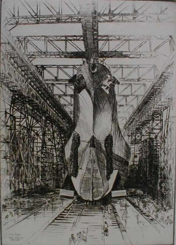 Etchings. Modern Print Makers: Townsend, Morgan F. 3 etchings. * Pennell, J., architectural subject. * Ryerson, Margery. "Duet." Signed in pencil. Mat burn. * Stern, Alec. Launch of the Iowa. 1942.