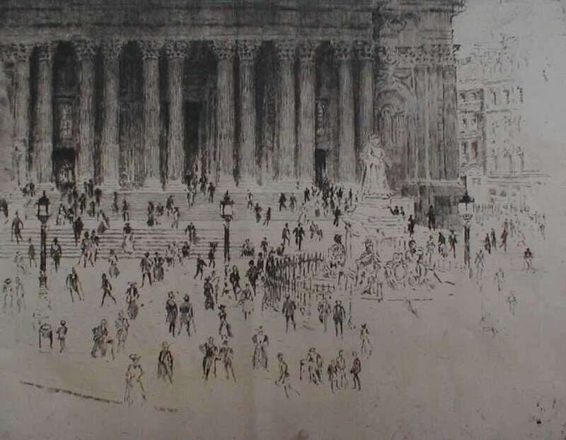 Late 19th & Early 20th Century Printmakers. Gallagher, Wears. Waves. Etching. 6 1/2 x 9 1/2 inches (165 x 241 mm), margins. Mat burn at plate mark, signed in pencil. * Latham, J. R. Railroad train station. Etching. 10 3/8 x 3 1/2 inches (263 x 89 mm). Signed in pencil. * Smilie, James. Rough Riders in the Yosemite. Etching. 3 1/16 x 4 15/16 inches (778 x 125 mm). Glued down. * Pennell, Joseph. "St. Paul's Pavement." 1910. Etching. 8 1/2 x 11 inches (216 x 279 mm), full margins. Signed in the plate by Pennell. Mat burn across bottom 1/2 of image. Wuerth 366 (Austrian edition).