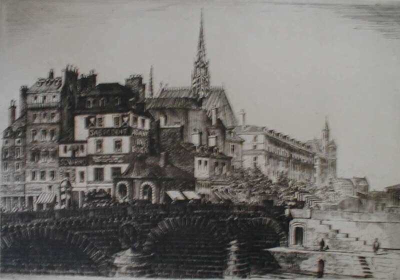 (Associated American Artists Prints): Grant, Gordon. "Reflection." Lithograph. 9 7/8 x 12 1/2 inches (250 x 318 mm), wide margins. Ca. 1947. Edition size approx. 250. * Whiting, Franklin P. "Napoleon Bridge, Paris." Etching. 8 1/2 x 12 3/8 inches (216 x 314 mm), wide margins. Ca. 1940. Edition size approx. 250. Each signed in pencil by the artist, lower right. Both generally clean.
