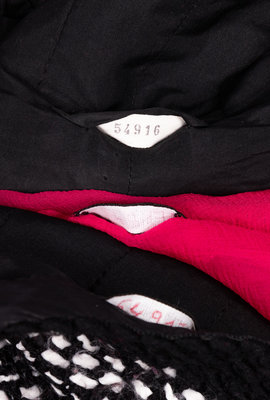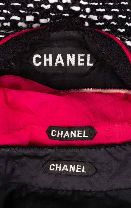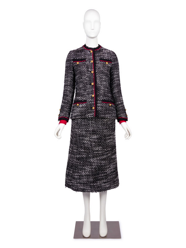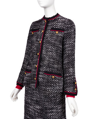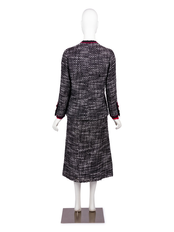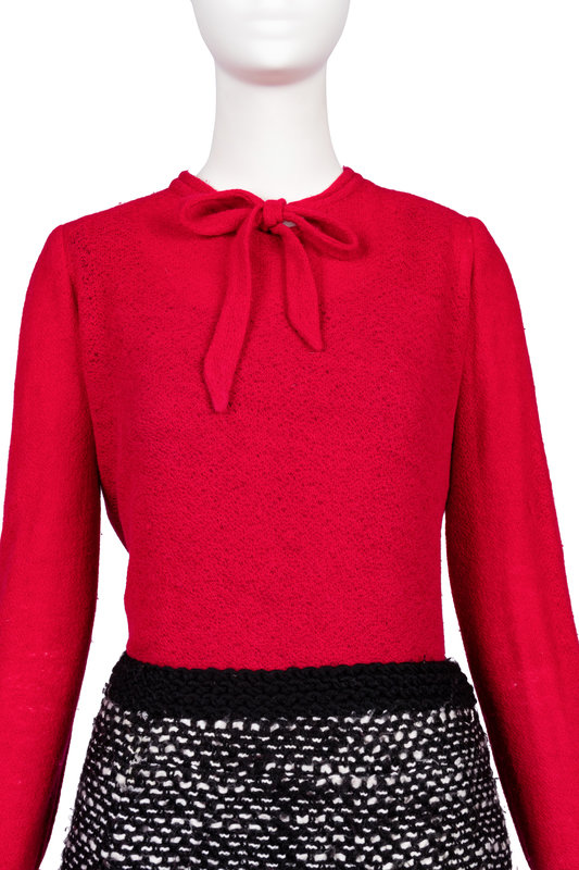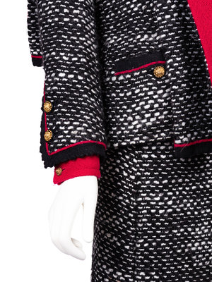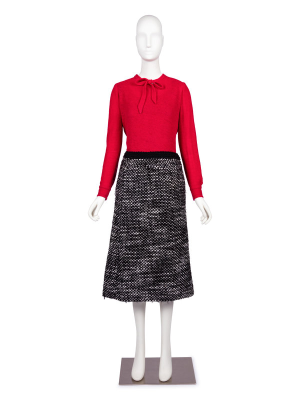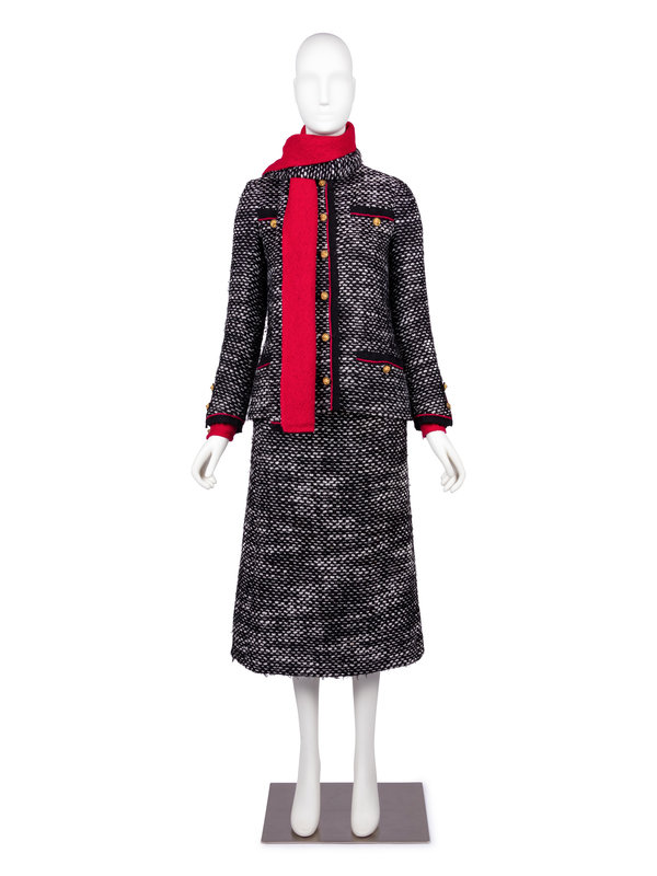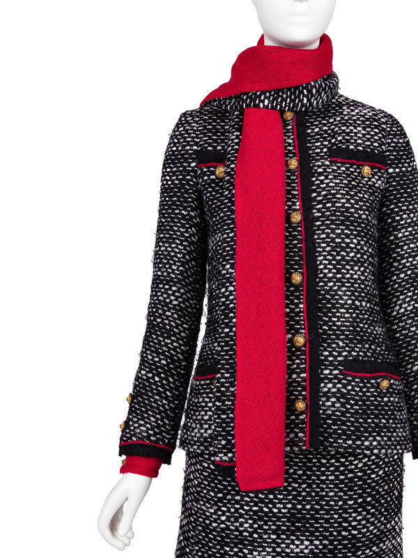 Black and white tweed jacket with jewel neckline, set-in long sleeves, four front patch pockets, and center front button closure; paired with a matching tweed skirt and a red knit top with crew neckline and extended neck ties, set-in long sleeves, and a center back zipper closure,. The scarf features the suit and skirt material on one side and the knit material of the top on the other.