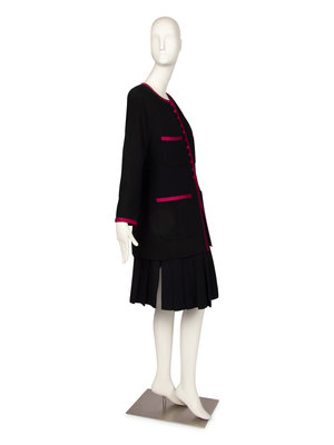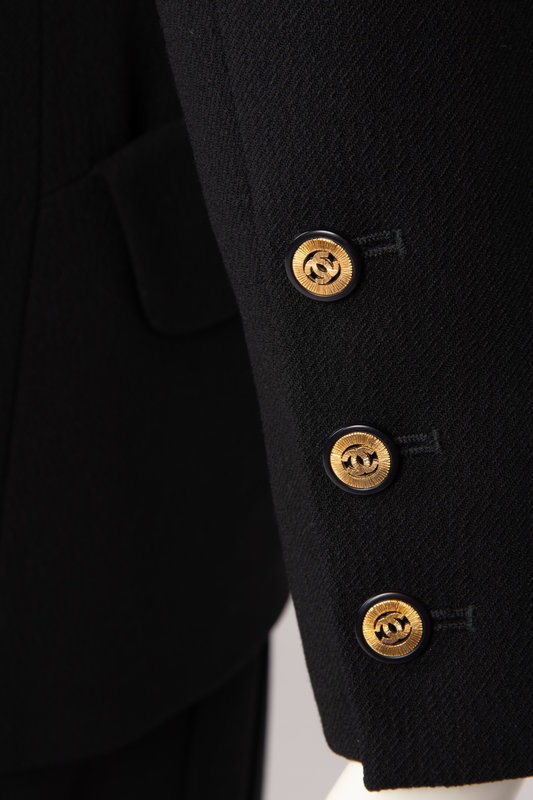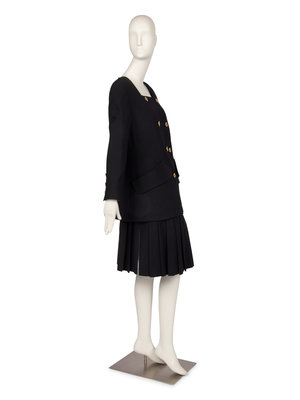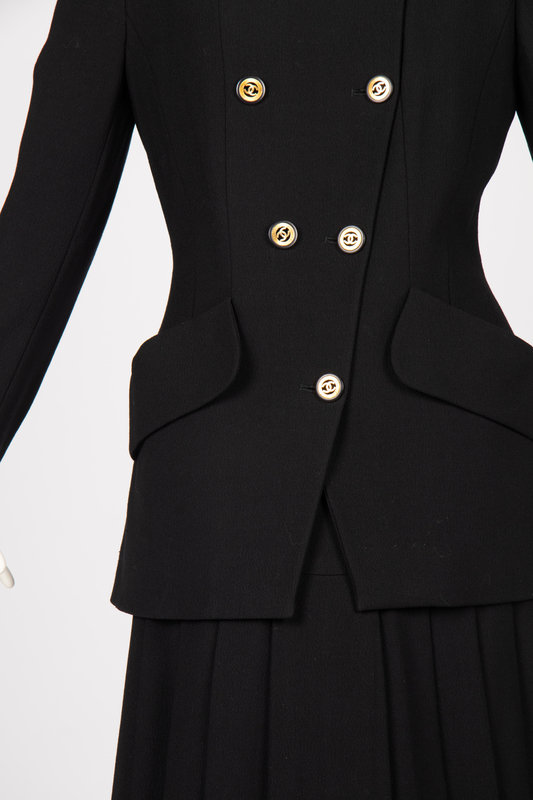 Black twill jacket and skirt. The jacket is cut with a double breated button closure, square neckline, set-in sleeves, and two flapped hip pockets. The center front buttons feature gold-tone CC logos. The jacket is fully lined in black silk featuring woven CC logos. The skirt has a wide waistband, is fitted through the hip with two patch pockets and a flared and pleated hem. The skirt is lined with black silk featuring woven CC logos. The skirt closes down the center back with a zip and hook and bar closure.