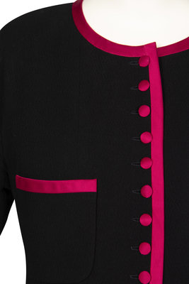 Black crinkle-weave jacket trimmed with rose/pink silk satin around neckline, center front closure, covered buttons, the top of each pocket and along the hem. The front of the jacket and the front of the sleeve are cut in one piece. The back of the jacket and the back of the sleeve are cut in one piece. The jacket is fully lined with black silk that features woven CC logos.