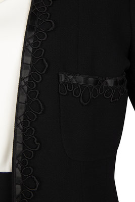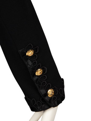 Black long jacket with crinkle weave, set-in long sleeves, four patch pockets on the front, and decoartive black thread and satin ribbon trim. The jacket hangs open at the center front, has no closures, and is fully lined with black silk featuring woven CC logos. Three gold-tone CC logo buttons close each sleeve hem.