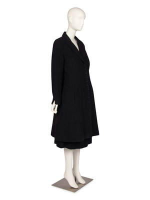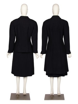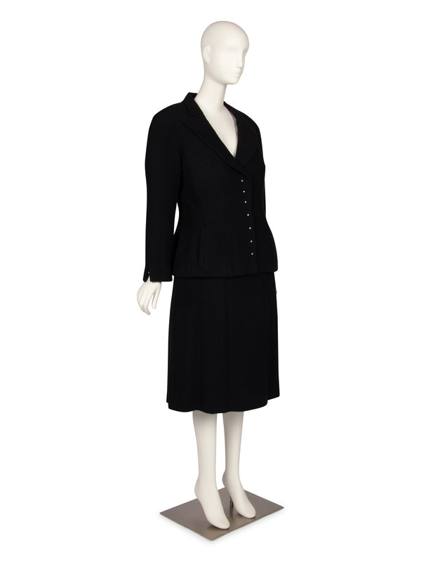 Black wool blend jacket and skirt. The jacket is cut with a notched lapel, set-in long sleeves, numerous vertical panels, raglan sleeve, and a center front pearl button closure. The jacket is lined with black silk woven with a flower and CC logo pattern and the interior hem is finished with a silver-tone chain. The skirt is made with vertical panels, waistband, and a zipper pocket over each hip that features a CC logo zipper pull. The skirt is lined in black silk.